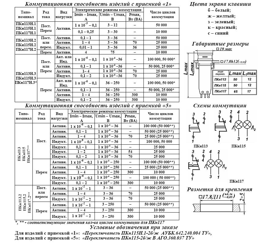 ПКН115-2б/сВ переключатель кнопочный, в том числе со световой индикацией и фиксацией, применяется для коммутации электрических цепей постоянного и переменного тока в радиоэлектронной аппаратуре. Климатическое исполнение В. Переключатели могут изготавливаться с тремя конструктивными исполнениями кнопок: 1 - с одноцветным неразделенным цветовым и световым полем. 2 –двухцветным симметрично разделенным цветовым и световым полем. 3 –двухцветным несимметрично разделенным цветовым и световым полем. Возможно различное сочетание полей.